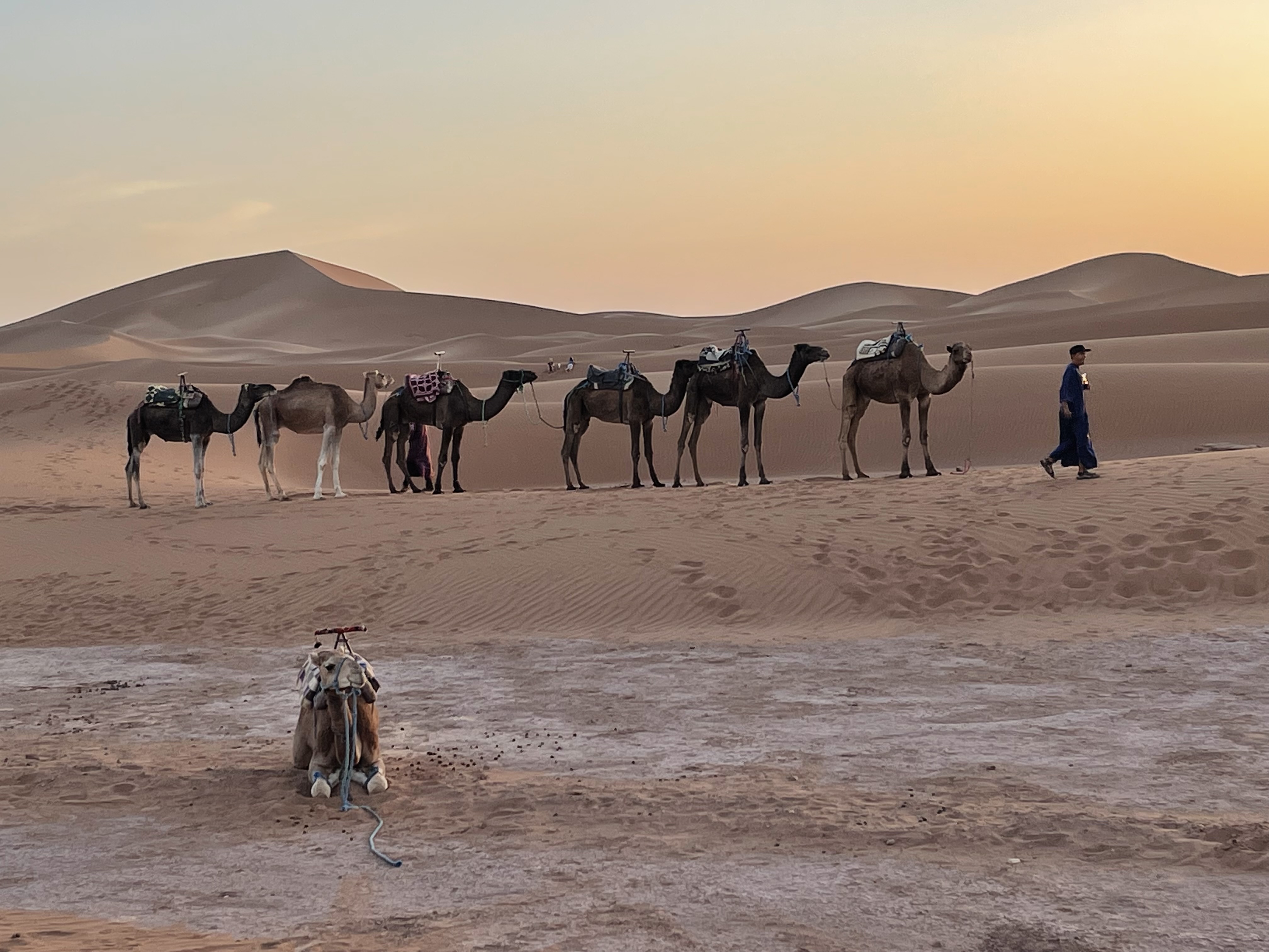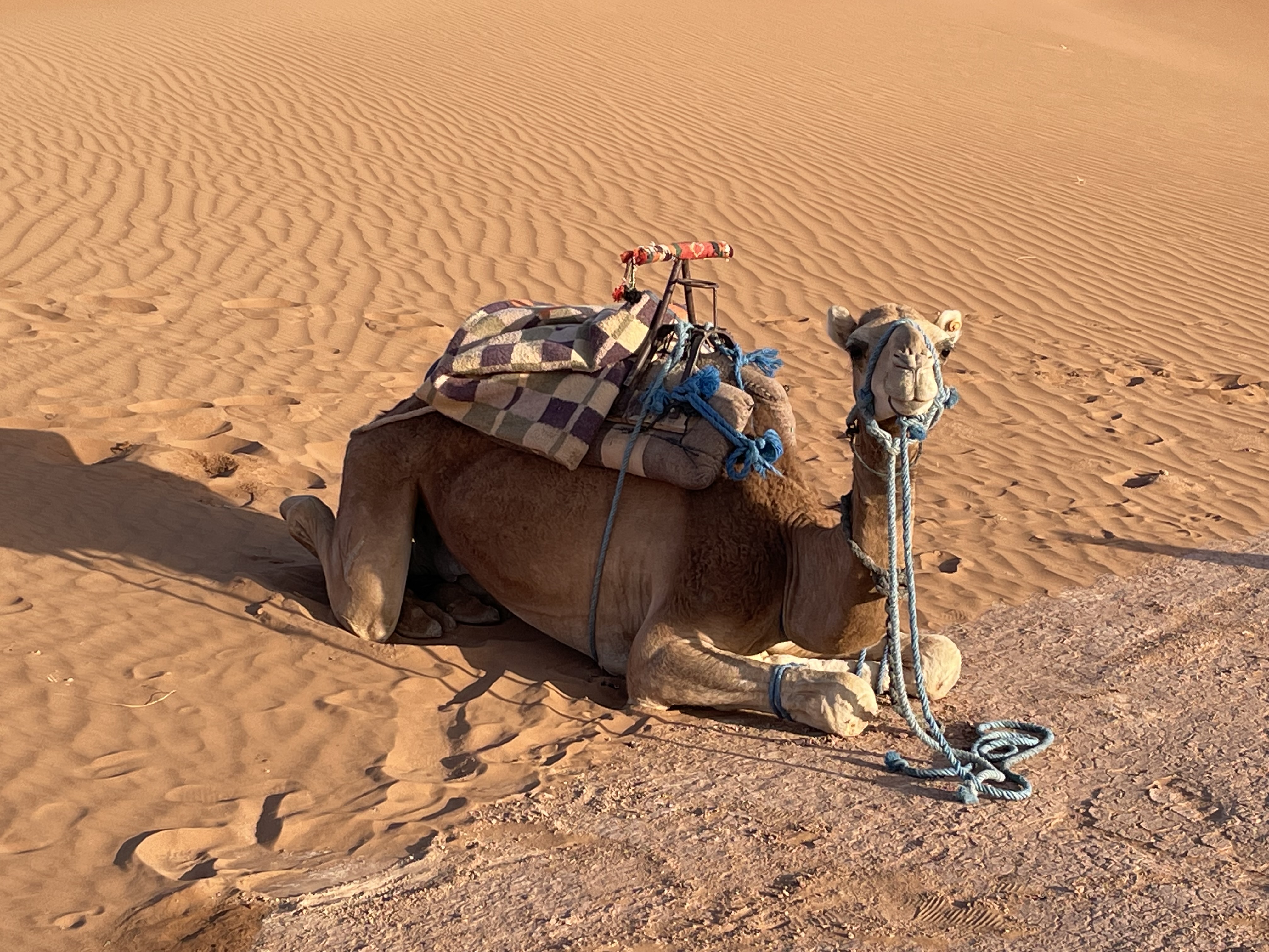 The next day our new Mercedes Benz van arrived with our driver and guide, Abdou. Our exotic journey through Morocco began for 6 lucky travelers in a van that could accommodate 12. We stopped in Fes and toured their medina and dinner in a fabulous Moroccan restaurant overlooking Fes. Next day onto Meknes…famous for its ancient medina and grain warehouse. In Marrakesh, we stayed several days at a nice hotel, well located. We enjoyed a medina walk in Marrakesh including a spice shop and leather factory. The next day our tour included visits to souks, Bahia Palace, and the Saadian tombs. We then drove further into Morocco to visit the ancient Kasbah of Ait Ben Haddou, where I bought a carpet. Ait Ben Haddou is the site of many films including Ben Hur and Game of Thrones. We traveled on to the Sahara desert in a 4×4 for an overnight in the Sahara at a comfortable well-appointed tent camp The sunset and sunrise in the Sahara desert were gorgeous. We even rode camels in the desert.