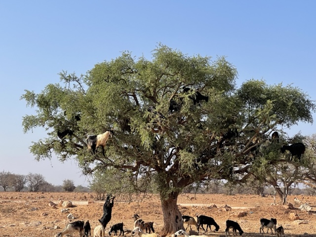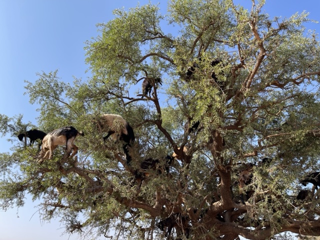 Further, travel to Morocco to visit the Ait Mansour Gorge that had a desert oasis! We did a lot of driving to see different areas of Morocco but were so comfortable in our 12 passenger van (w only 6 travelers). On the drive to Essaouira (a lovely coastal town with good surfing), we saw a tree with goats in it! Morocco is famous for its hair oil derived from goats. Moroccan artisans are very talented and work with wood, jewelry, leather, pottery. Morocco has a trove of spices that we enjoyed and bought. We ate a lot of tangines!